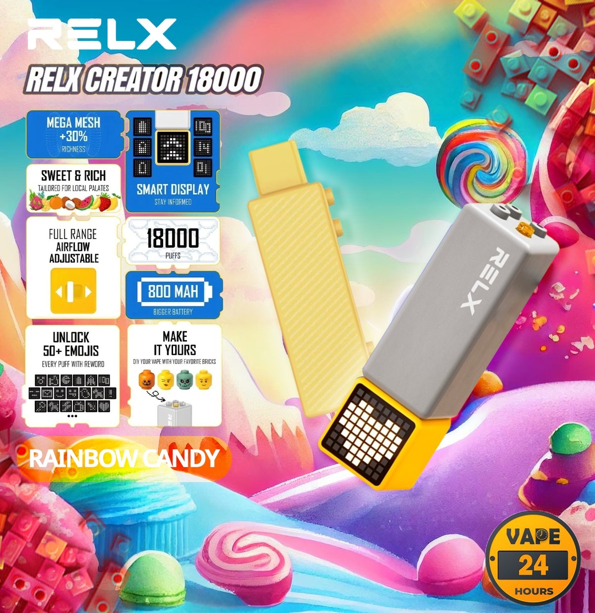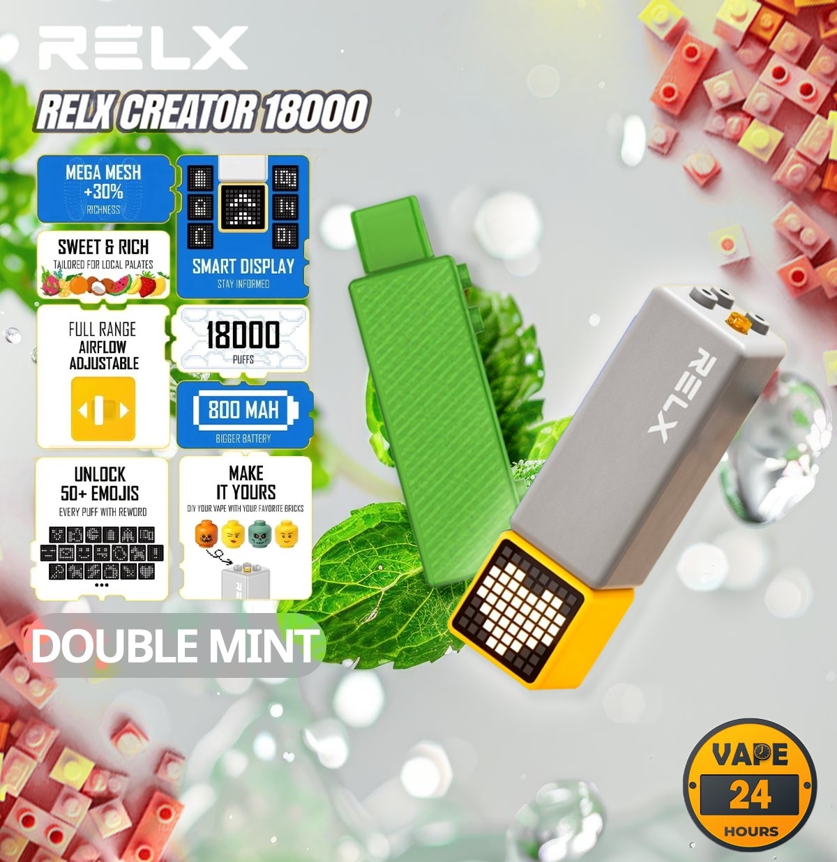 Relx Creator 18000 Puffs เป็นพอตใช้แล้วทิ้ง รุ่นใหม่ล่าสุด มาพร้อมกับ นวัตกรรม Mega Mesh รีดกลิ่นของน้ำยา ได้ชัดเจนมากกว่า แถมยังสามารถสูบได้ถึง 18000 คำเลยทีเดียว สามารถเปลี่ยน หัวน้ำยา Pod ได้อีกด้วย แถมยังมีหน้าจอแสดงผล ที่มีหน้าอีโมจิถึง 50 แบบเลย และ ยังแสดงสถานะ แบตเตอรี่ ได้ชัดเจนมากๆ มาพร้อมกับ รสชาติ ที่มีให้เลือกถึง 8 รสชาติเลย กลิ่นชัด ควันตูมๆแน่นอน